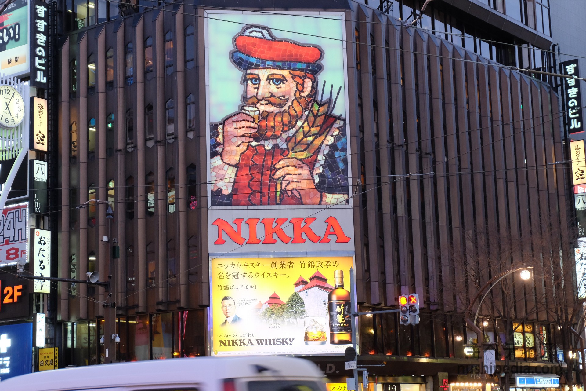 2022年12月31日-2023年1月1日にかけて配信された「2022年最後の日。七原くんの24時間放送」で七原くんが訪れた、北海道札幌市のすすきの交差点にあるニッカウヰスキーの看板です。
