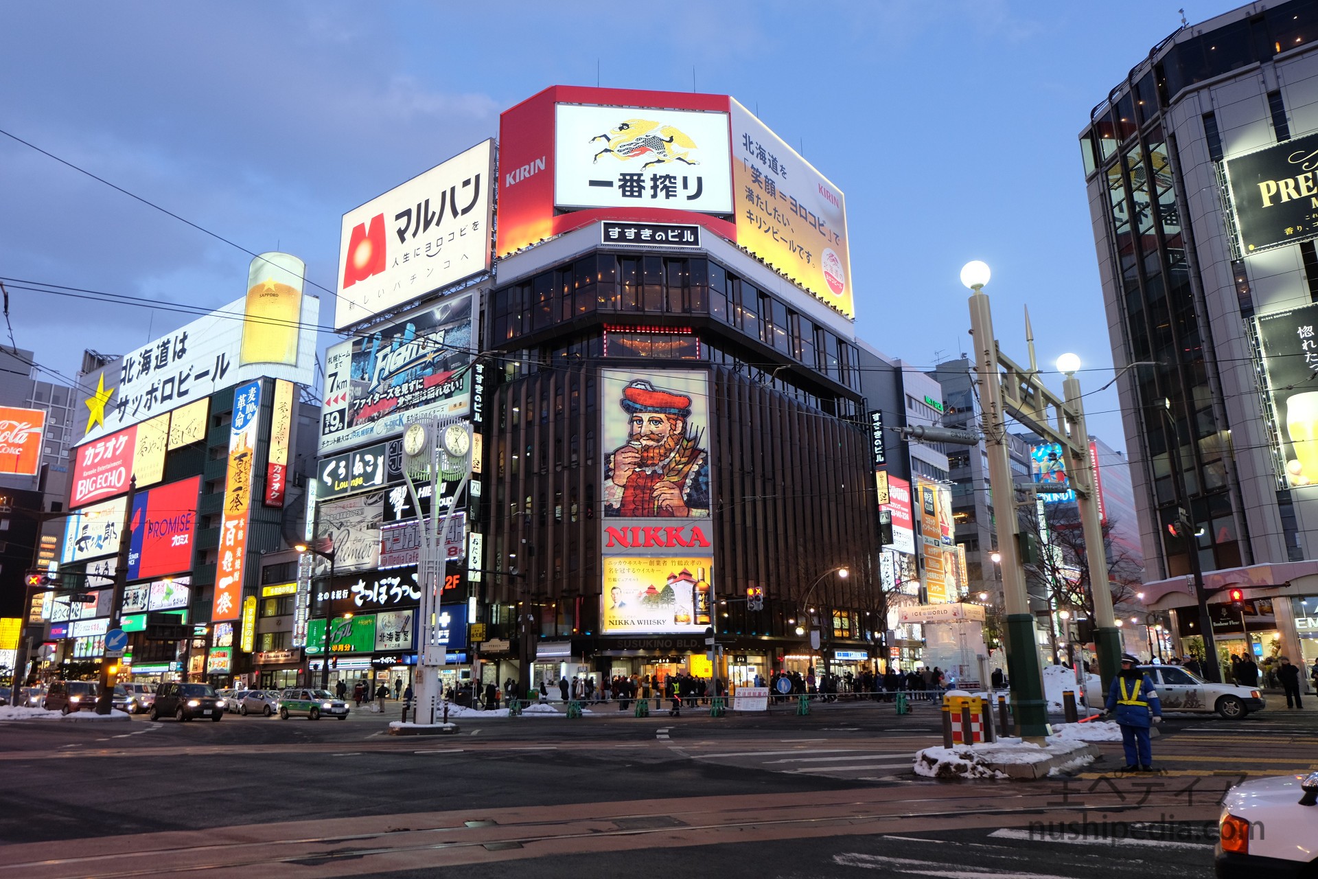 すすきの交差点は「月寒通」と「国道36号線」が交わる位置にある交差点で、札幌の中心地で最大の繁華街に当たり、ここに大きく掲示されたニッカの看板は撮影スポットにもなっています。