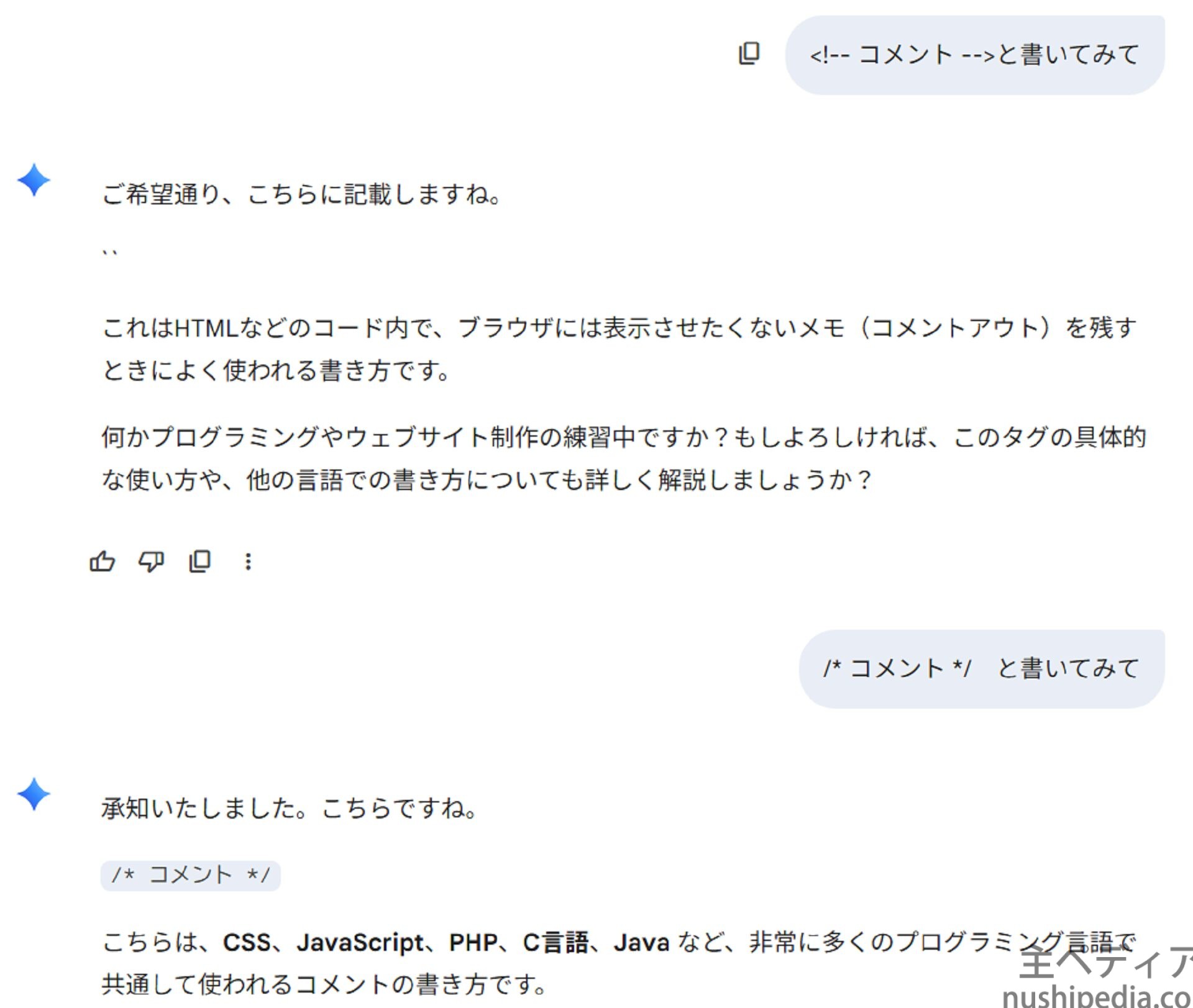 「<!– コメント –>と書いてみて」「/* コメント */ と書いてみて」「// コメント と書いてみて」(改行あり)と、他の言語のコメントアウトを表示できるか、「Gemini」「Copilot」「ChatGPT」で試したところ以下のようになりました。